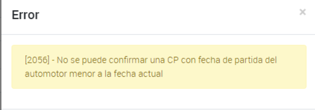 Al intentar obtener una CPE de venta (emisión del CTG) aparece el aviso “(2056) No se puede confirmar una CP con fecha de partida del automotor menor a la fecha actual”