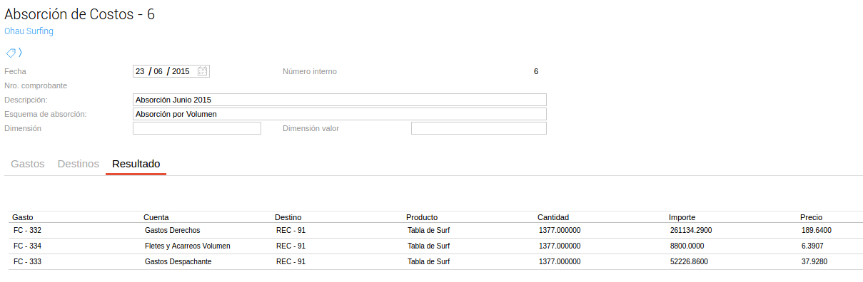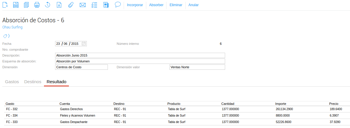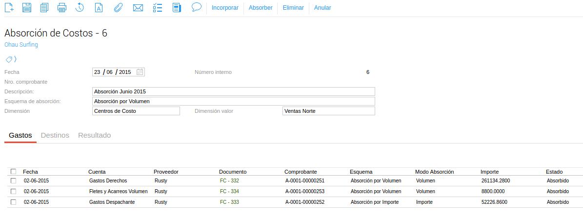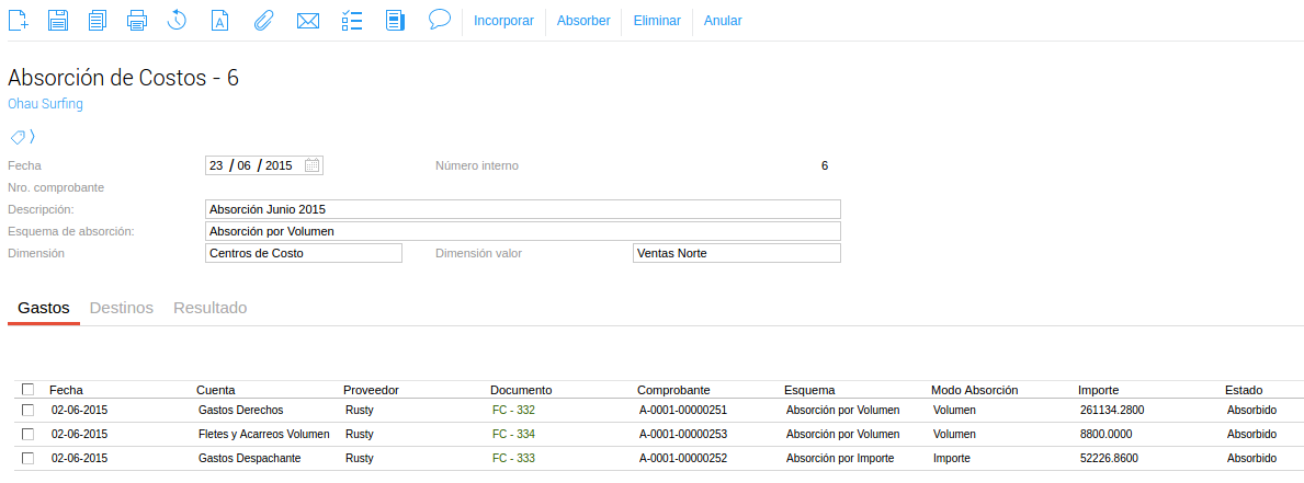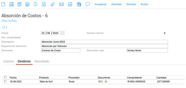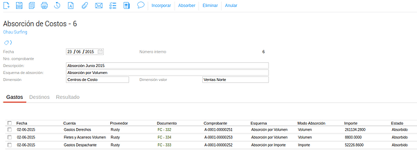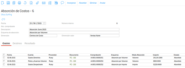 En la absorción de costos se visualizan tres solapas: “Gastos”, “Destinos” y “Resultado”.