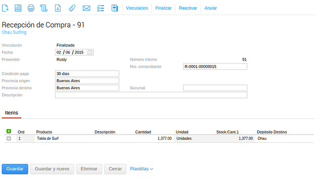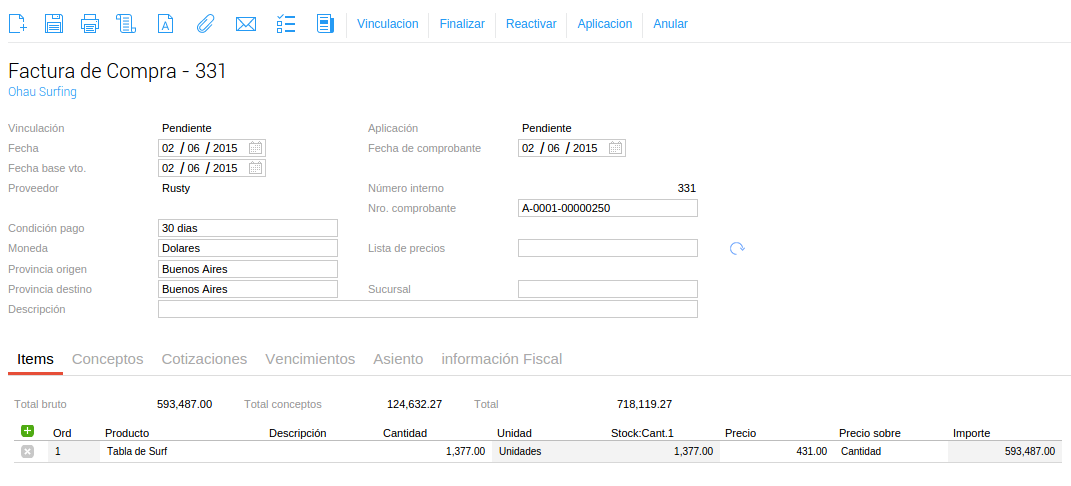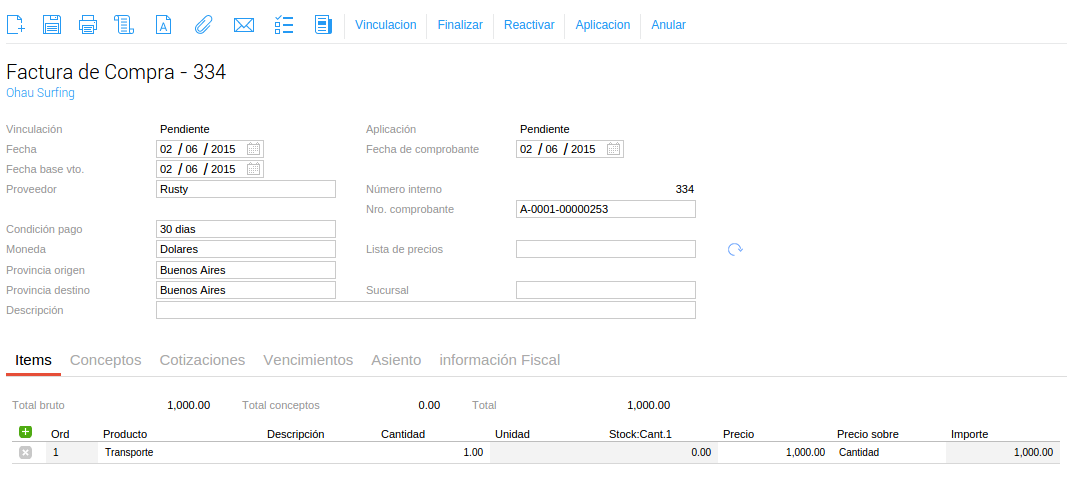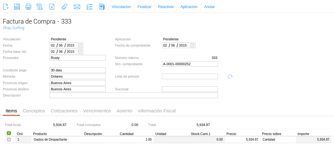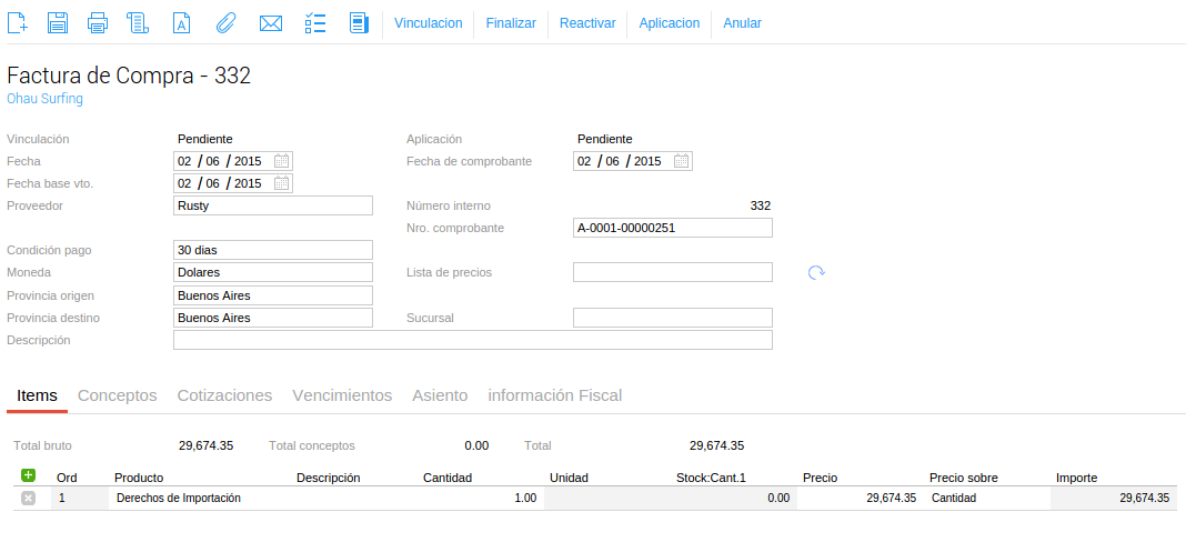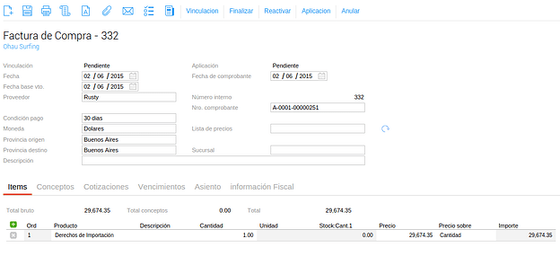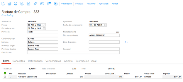 Se carga la factura de compra. Puede estar vinculada o no a la recepción.