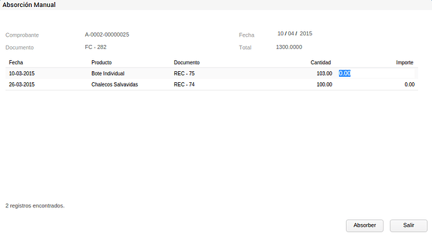 Se despliega una ventana con una grilla donde se debe ingresar manualmente el importe, mientras que la cantidad, no es editable.
