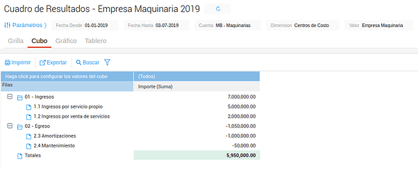Gracias a indicar en cada operación a qué bien de uso corresponde, podrás luego hacer un análisis de gastos por máquina o por bien de uso (para saber cuánto se gastó, por ejemplo, en mantenimiento de un tractor). Vas a poder ver cómo se compone el saldo tanto de las cuentas patrimoniales referidas a bienes de uso como las cuentas de resultado, para saber cuál fue el resultado o los costos de cada máquina.