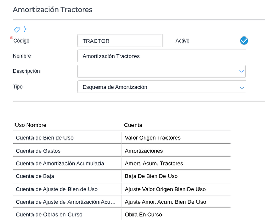 En el esquema contable se asignan todas las cuentas que corresponden usar cada vez que se amortice un determinado bien: cuál es la cuenta de obra en curso, la de valor de origen, la de amortización, de amortización acumulada, la de ajuste, entre otras.