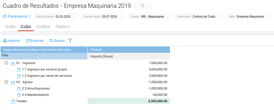 Esta información te permite determinar el margen bruto individual de cada máquina. También puedes obtener un margen bruto consolidado de la unidad de negocios de maquinaria, abarcando los ingresos y gastos de todas tus máquinas.