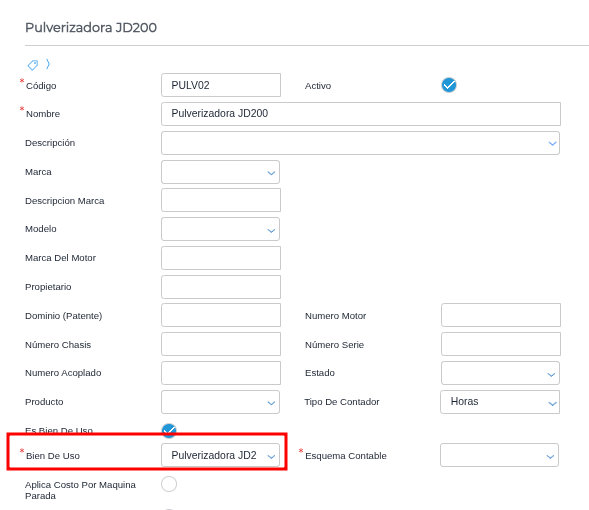 Dentro del maestro de máquina, se elige la máquina y se le asigna el bien de uso correspondiente: