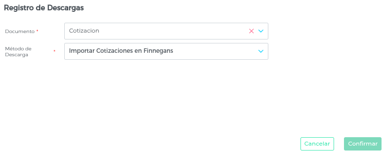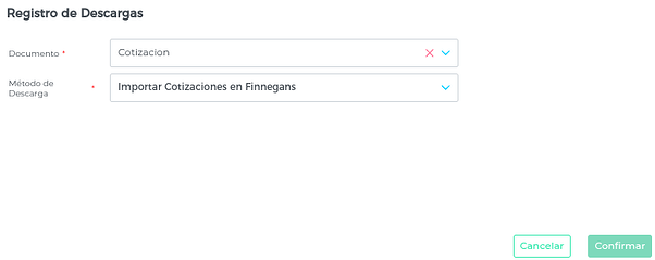 En el pop up que se abre, seleccionar Cotización e Importar cotizaciones en Finnegans en los campos correspondientes y clickear en Confirmar: