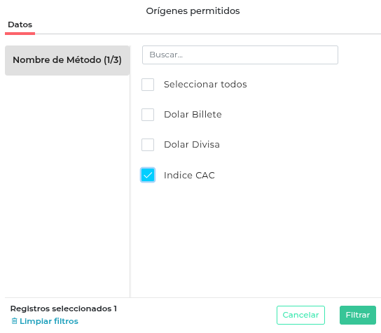 Con ese checkbox se habilita la solapa “Orígenes permitidos”, donde se seleccionará la opción Índice CAC y clickear en Filtrar: