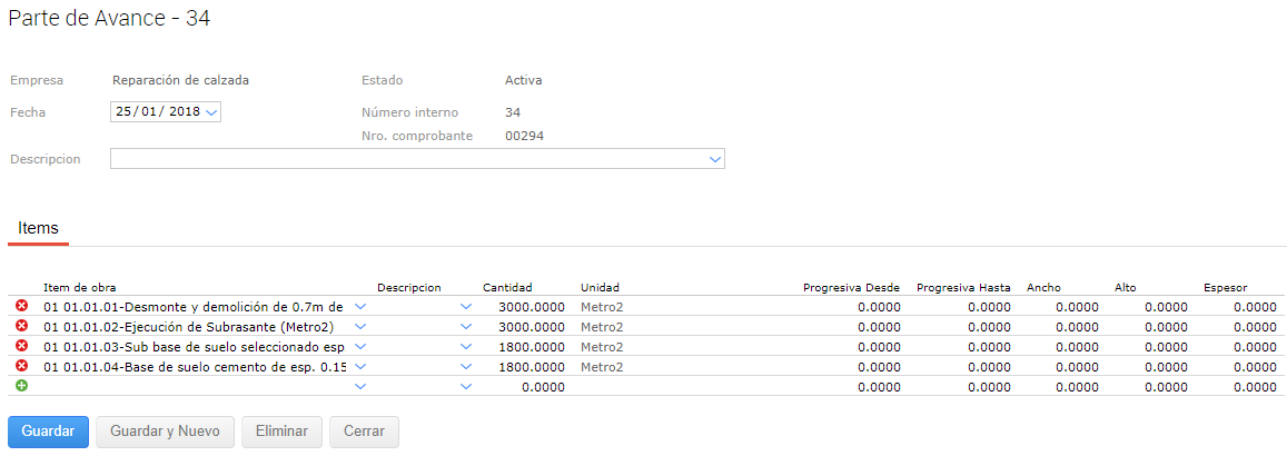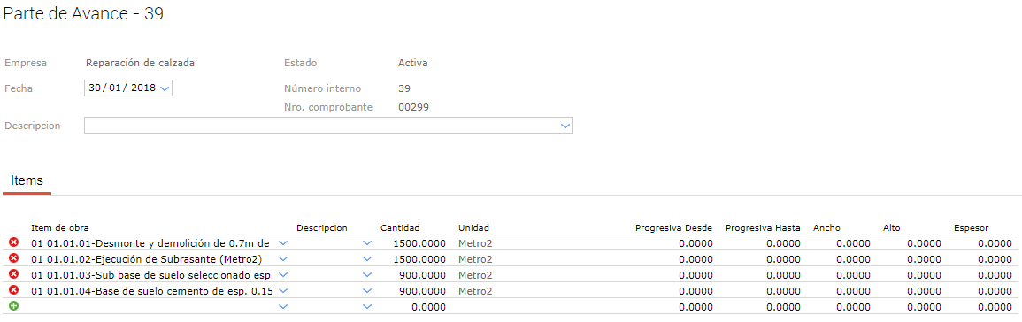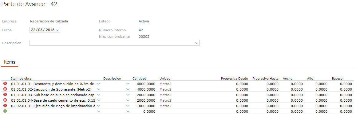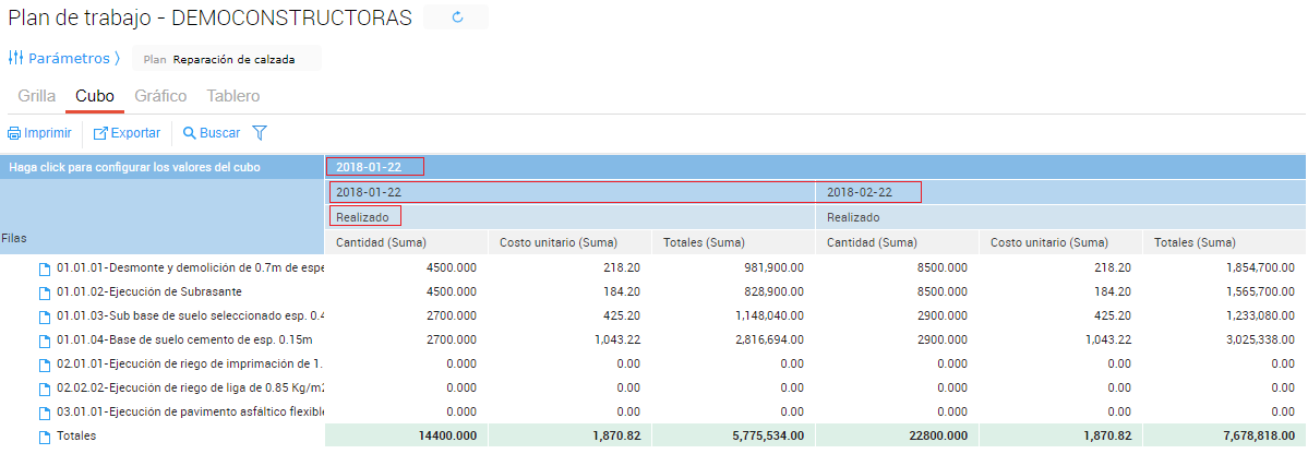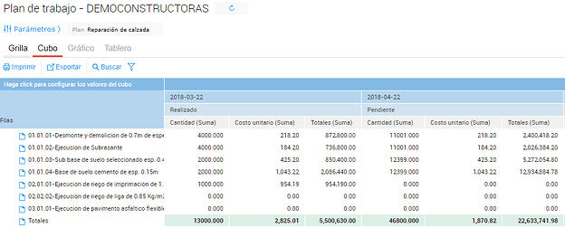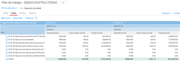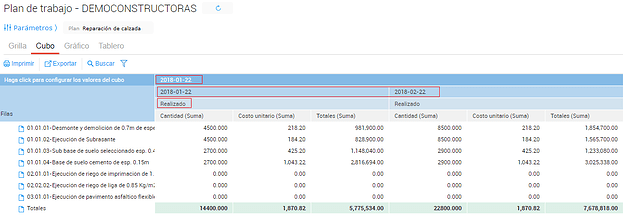 - 2018-01-22 y 2018-02-22: Corresponde a cada mes de la obra, cada período incluye las cantidades de avance correspondiente a los partes de avances registrados en dichos periodos de tiempo.
