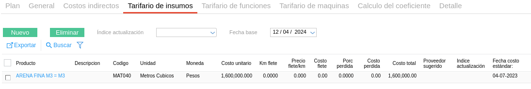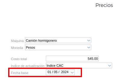 De forma análoga, se puede seleccionar una fecha base global para todos los ítems desde la solapa General. En caso de que sea necesario que un recurso en particular tenga una fecha base específica, se accede al mismo desde el tarifario correspondiente y se completa de manera manual la fecha base como muestra la siguiente imagen: