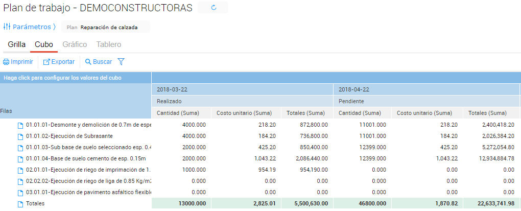 Como se observa, el importe de los ítems pendientes al 22/04 corresponde a los ingresados en el plan pues no se ha realizado ninguna actualización de precios. Sin embargo, al observar detenidamente, las cantidades a realizar no corresponden a las establecidas en el plan, si no que son mayores. Esto es así debido a que el sistema suma las cantidades pendientes de realización en un mes al mes siguiente, de ésta manera, el jefe de obra sabe qué cantidades debe realizar en cada periodo de tiempo a fin de cumplir con los tiempos planificados.