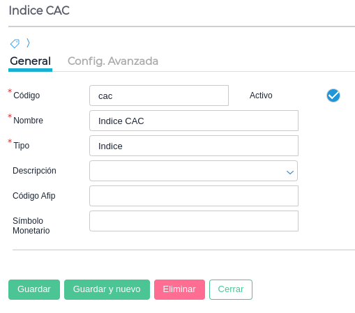 En la cabecera se define el nombre y el código, se marca la casilla de “Activo” y el campo “Tipo” se completa seleccionando Índice de la lista desplegable.
