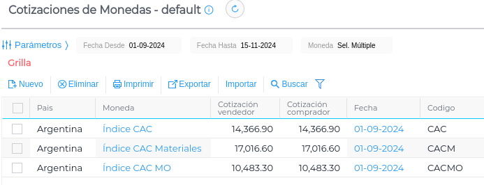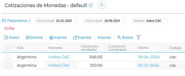 Arriba a la derecha, se encuentra el botón Ver cotizaciones, que abrirá el maestro de Cotizaciones de monedas para visualizar las cotizaciones y agregar nuevas