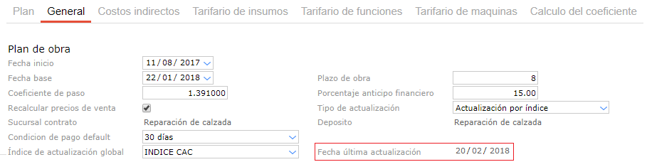Dentro de la Planificación de Obra, en la solapa General se encuentra el campo “Índice de actualización global de costos”; al seleccionar uno de la lista desplegable, el mismo se carga de manera global en todos los recursos del plan de obra.