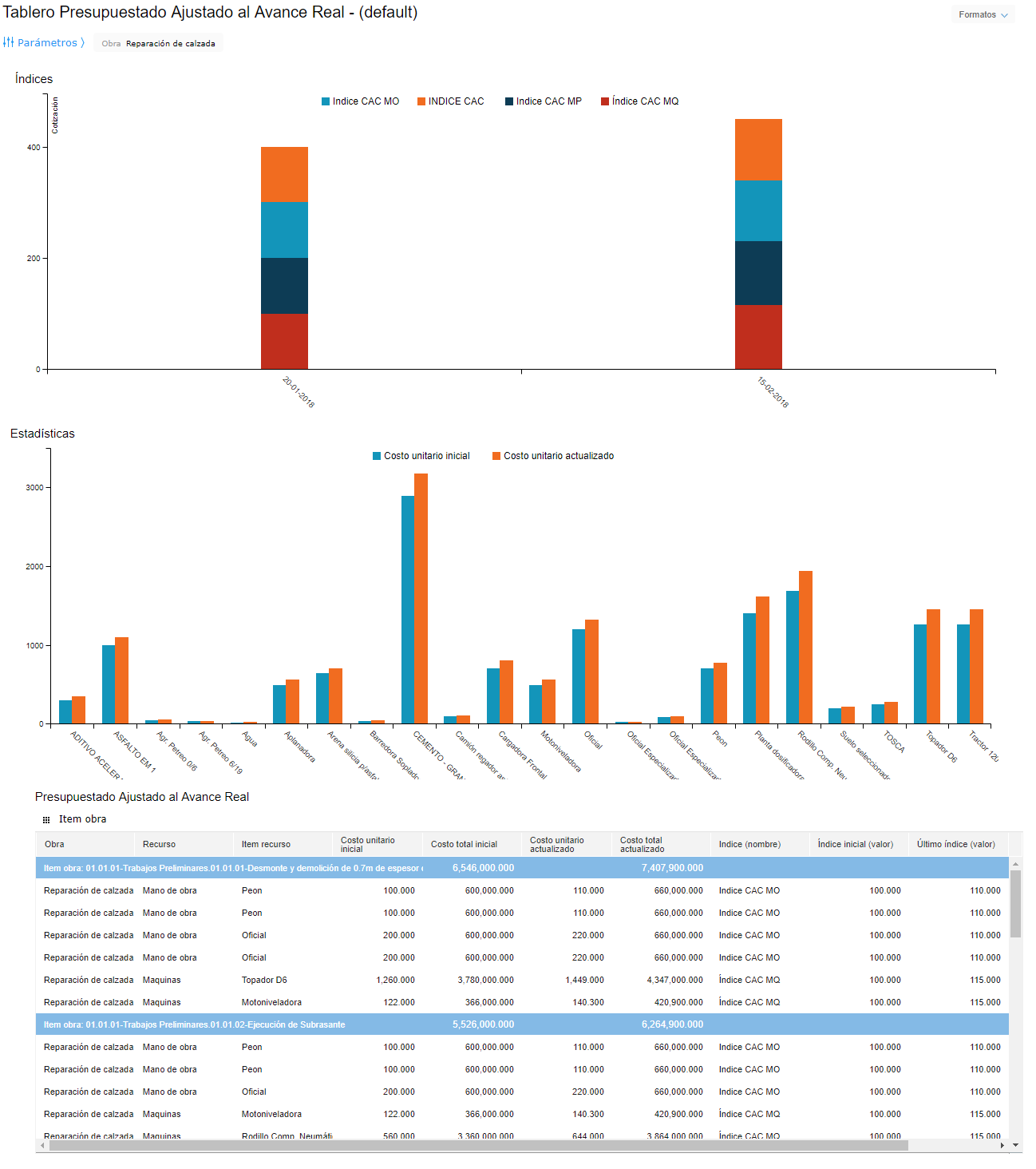 Y una grilla que muestra el costo inicial tanto de los ítems de obra y sus recursos como el valor actualizado de los mismos.