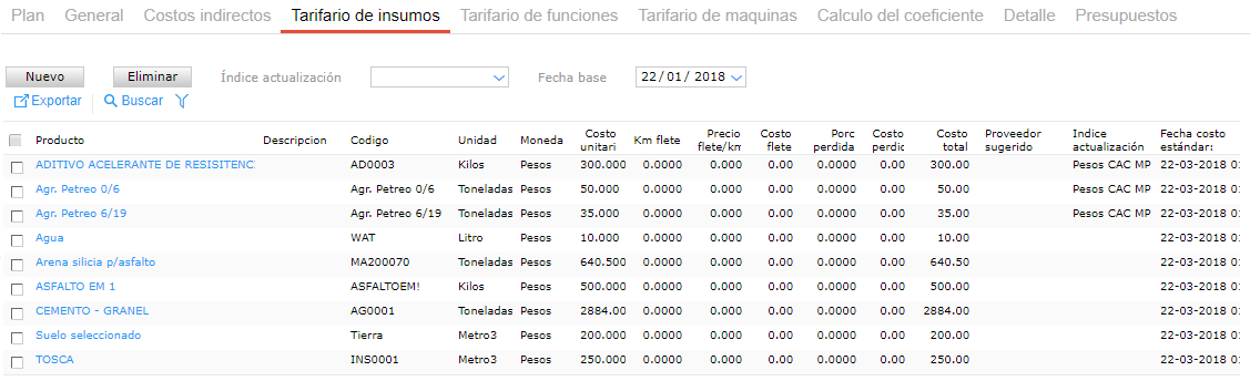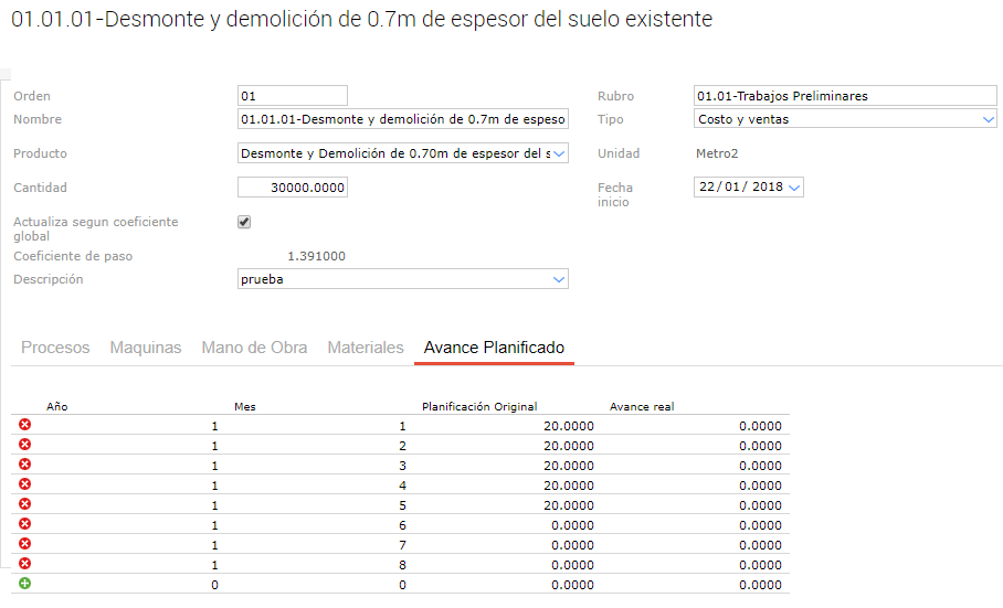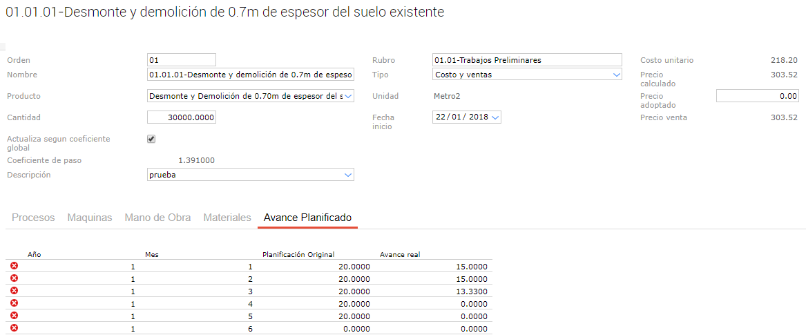 - 2018-01-22: Corresponde a la fecha de actualización, en este caso, como aún no se realizó ninguna actualización, los costos son iguales a los planificados.