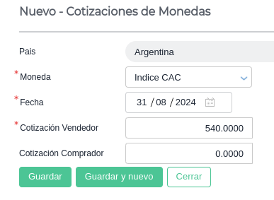 Es importante aclarar que los índices previamente deben ser definidos en el maestro de Monedas.