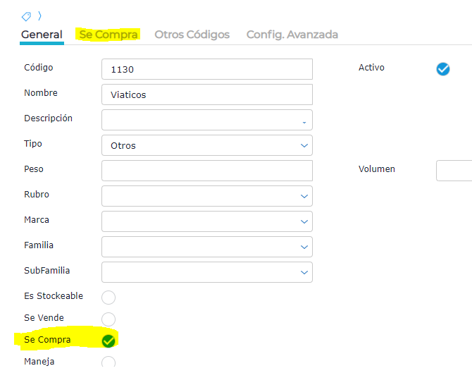 - Tildar la opción “Se compra” para que se habilite la solapa Compras