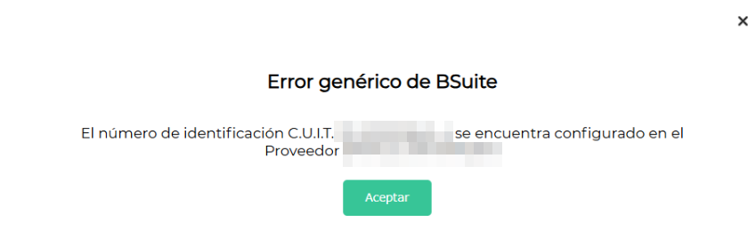 Al intentar agregar un proveedor, el sistema arroja un error genérico de BSuite.