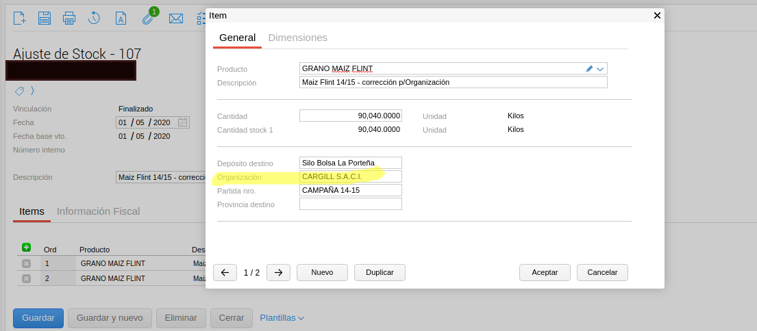 Hay que sacarle la organización al ajuste que da de alta stock para que quede en la propia.