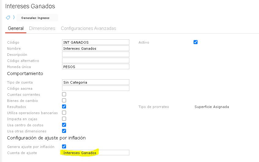 - Marcar el check “Genera ajuste por inflación” y seleccionar la misma cuenta para “Cuenta de ajuste”.