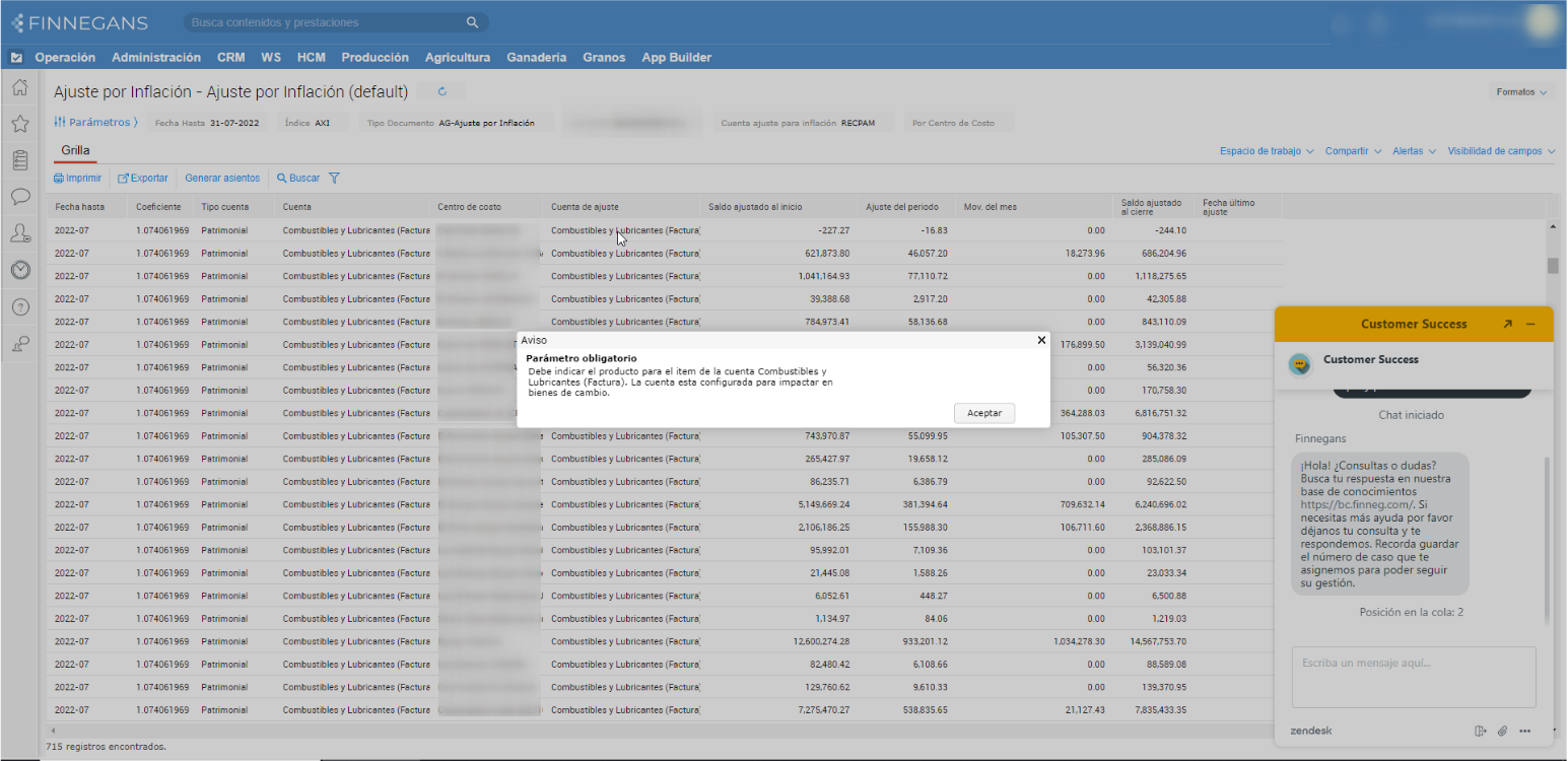 Al querer generar los asientos de ajuste por inflación, el sistema arroja el siguiente aviso: