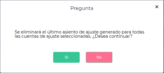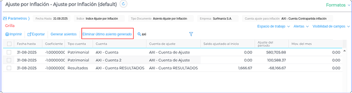 - Funcionamiento: Al seleccionar una o más líneas y presionar el botón, el sistema eliminará el último asiento generado para la “Cuenta de Ajuste” correspondiente.