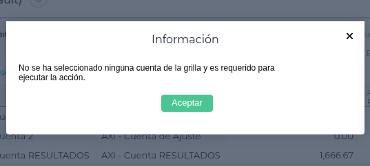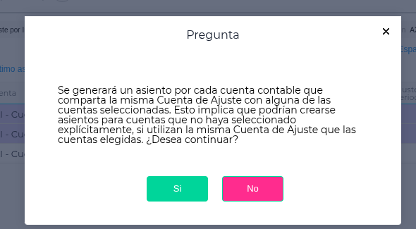 Advertencia de Cuentas Vinculadas: Si seleccionas una cuenta que comparte la “Cuenta de Ajuste” con otras no seleccionadas, el sistema generará asientos para todas ellas. Antes de hacerlo, mostrará un mensaje de advertencia claro: