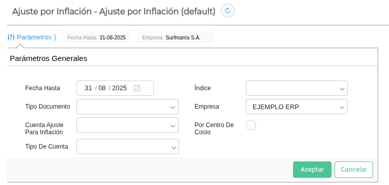 - Tipo de documento: Seleccionar el Asiento genérico de ajuste por inflación.