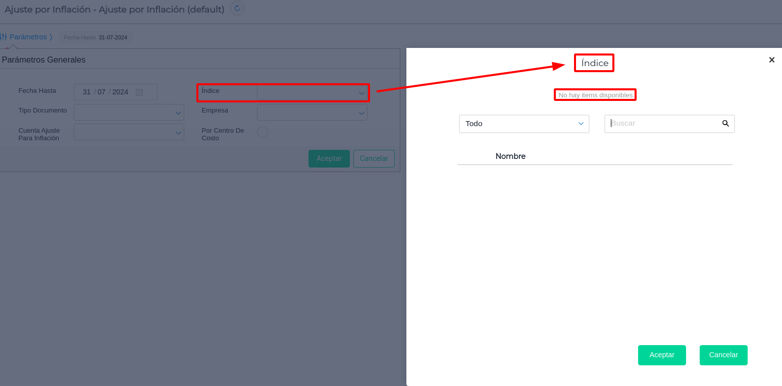 ¿Por qué cuando intento seleccionar un índice en los parámetros de Ajuste por Inflación no me aparece ninguno?