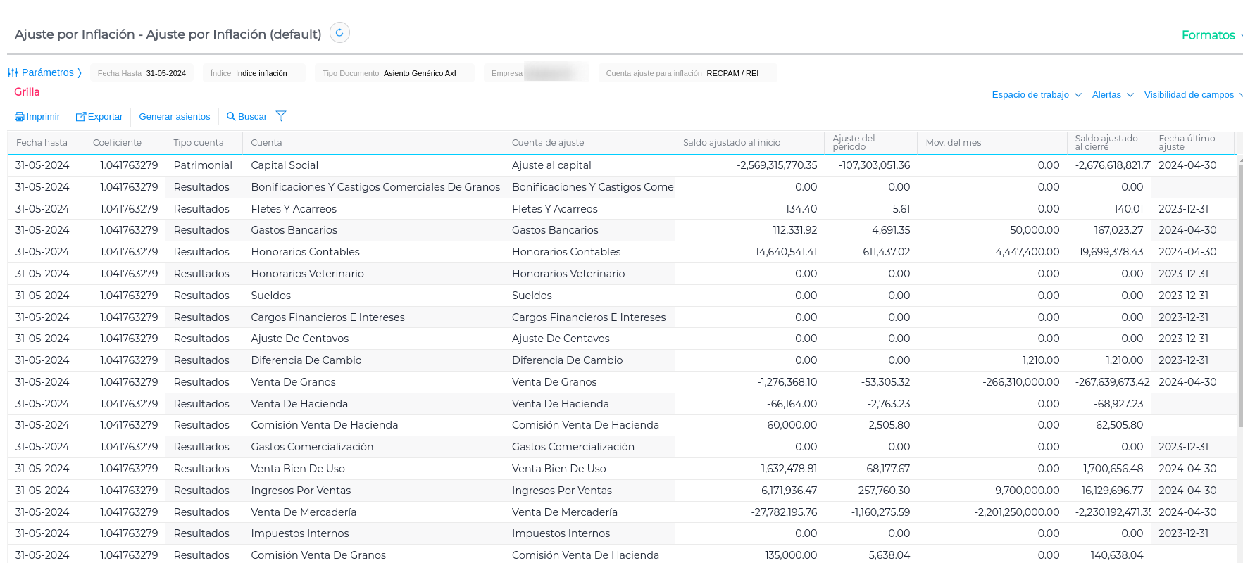 La grilla muestra todas las cuentas contables configuradas para ajustar por inflación que tengan saldo en el período indicado en el parámetro.