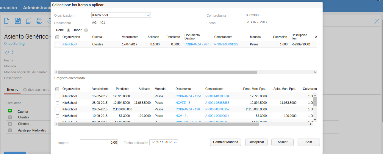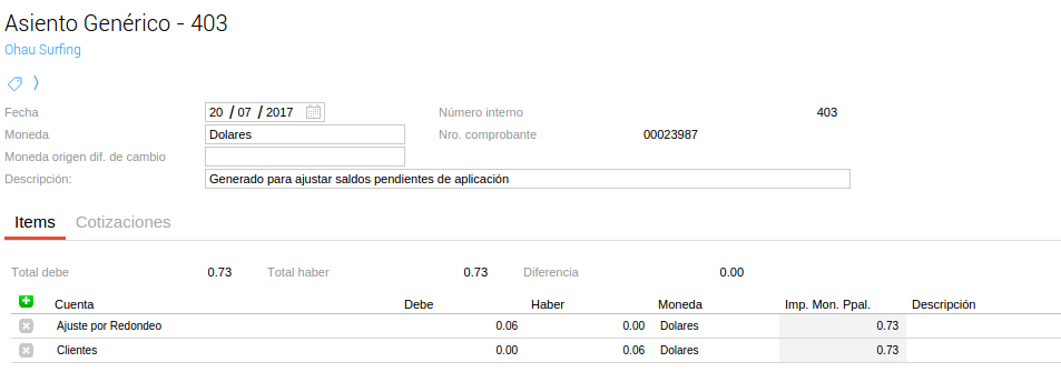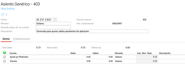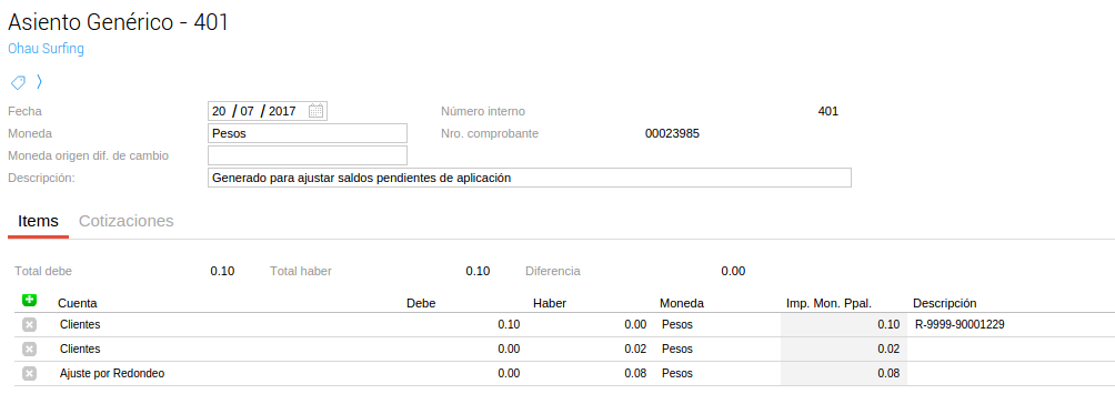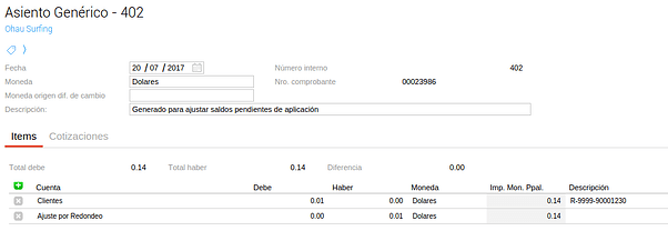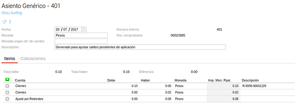 Se desarrolló una funcionalidad que permita generar asientos de ajuste de saldos de cuenta corriente (generalmente centavos) en forma masiva y que queden aplicados a los comprobantes que los originan. Aplica tanto para Clientes como para Proveedores.