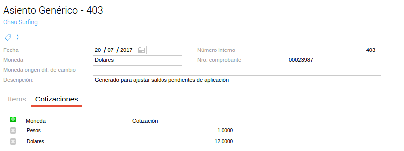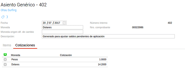 Si la moneda del comprobante es distinta de la principal, se generará un asiento por cada comprobante a ajustar.