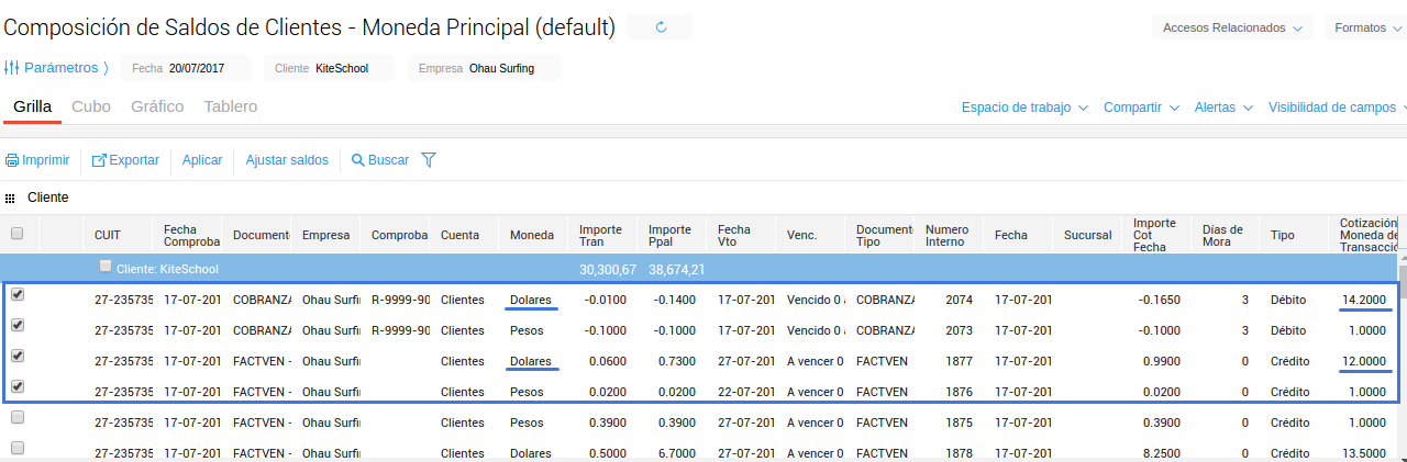 En la imagen se observan seleccionados dos comprobantes en dólares, con cotizaciones diferentes y dos documentos en pesos.
