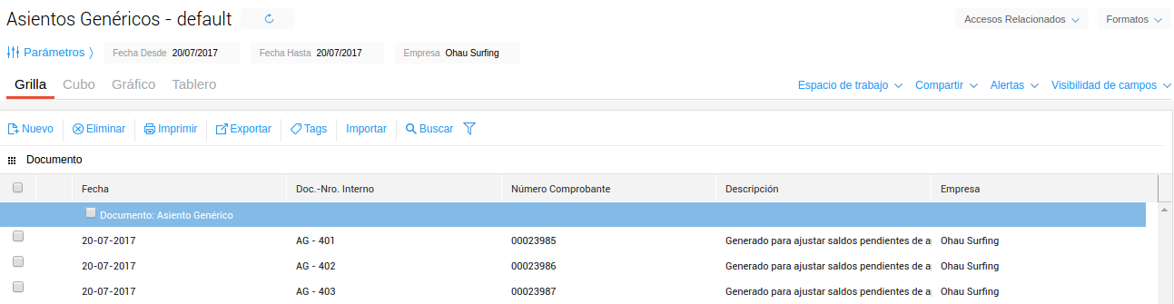 Tipo de asiento a generar: permite seleccionar los documentos de categoría Asiento Genérico.