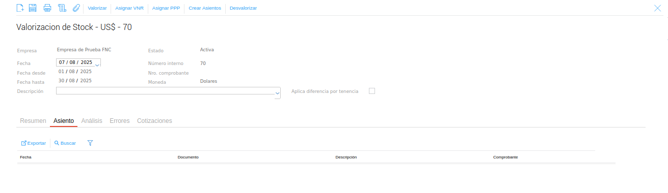 Al realizar una valorización de stock en pesos para ciertos insumos, se generan correctamente los asientos en pesos pero al realizar la valorización en dolares, no se generan los asientos en dolares.
