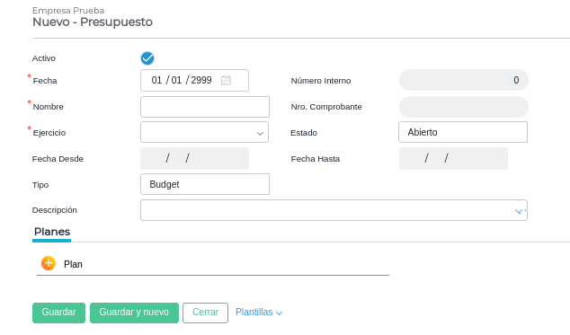 - Nombre: ingresar el nombre del presupuesto que permite identificar al mismo.