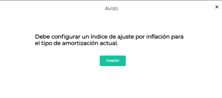 El mensaje se visualiza porque varios bienes de uso y varias cuentas que están asignadas a los esquemas contables están configurados para “Ajustar por inflación”. Cuando esta configuración está activada, el sistema exige indicar un índice de inflación.