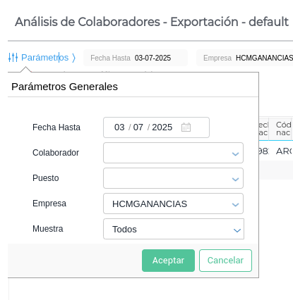 Puesto: seleccionar los puestos de los colaboradores a obtener, si no se completa traerá la información de todos los puestos