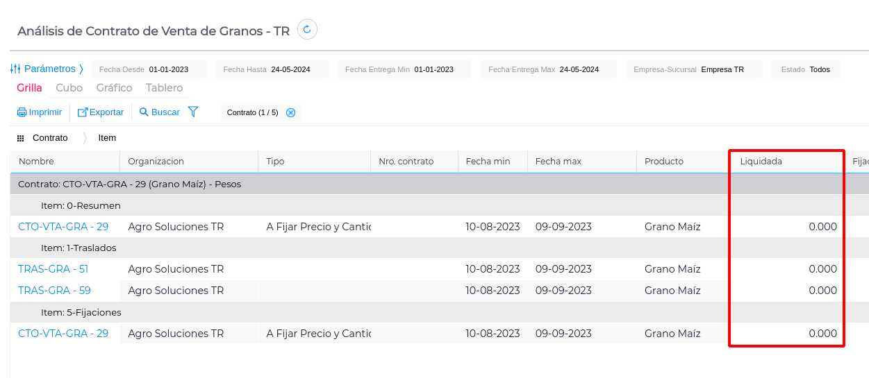 El informe de Análisis de Contrato de Venta de Granos no expone cantidad liquidada cuando sí la hay: