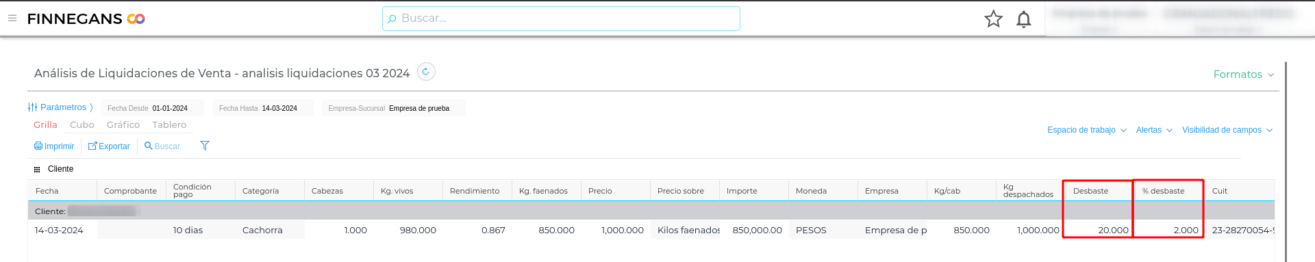 Al revisar el reporte Análisis de liquidaciones de venta de Hacienda, vemos que tenemos disponible el campo “Desbaste” y "% de desbaste