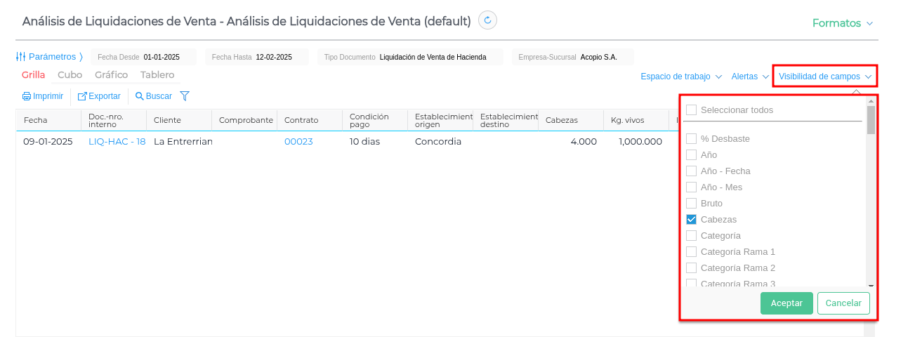 En “visibilidad de campos” encontrarás gran variedad de columnas con los principales datos informativos. Ahí seleccionas los que te interesen y guardás formato.