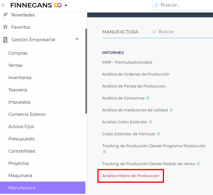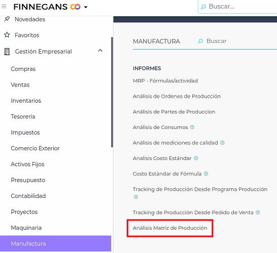 El informe se halla en Menú → Gestión empresarial → Manufactura → Informes
