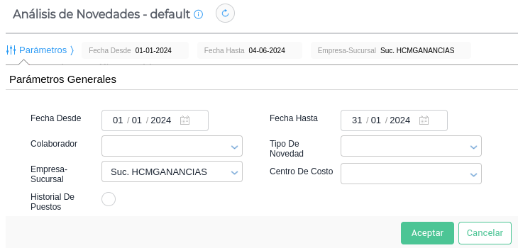 - Con historial de puestos: se ve el puesto que tiene el colaborador asignado a la fecha de la novedad. Si es con vigencia, mostrará una línea por cada puesto que tuvo durante su vigencia.