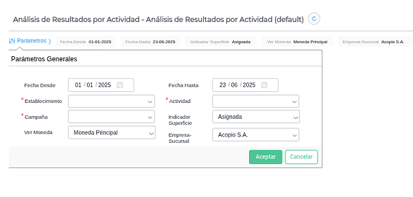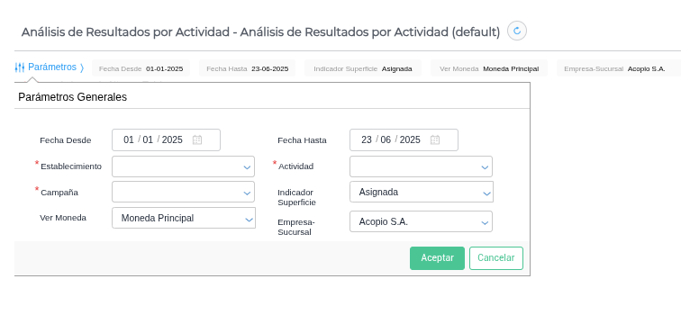 Menú → Gestión Empresarial → Contabilidad → Análisis de resultado por actividad
