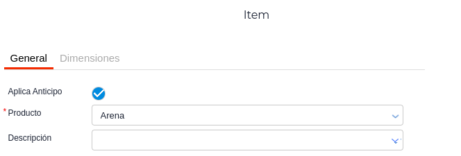 Si el campo “producto” en el tipo de documento de la factura se deja vacío, será necesario indicar el producto de anticipo manualmente en el pedido de venta, en la solapa “anticipo financiero” .