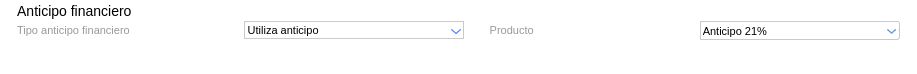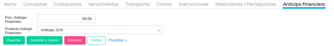 4- Productos anticipo con distinta tasa impositiva: si se quiere un producto de anticipo con distinta tasa impositiva, deberán crearse tantos productos como tasas impositivas se quieran utilizar. Por ejemplo, "Anticipo financiero 10.5% y “Anticipo financiero 21%”.
