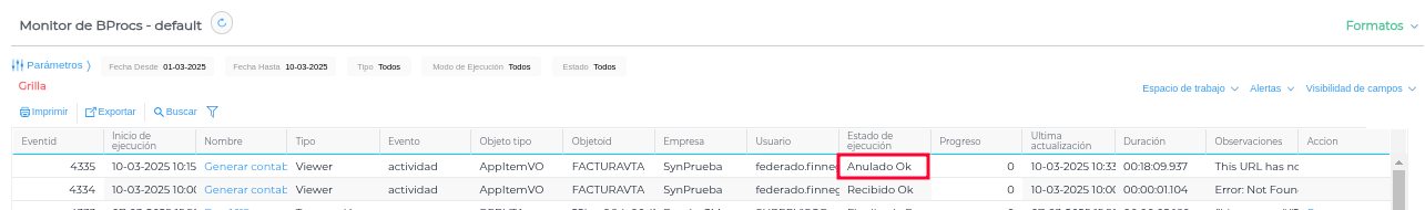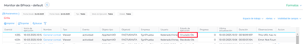 Posteriormente al ejecutar nuestro bproc con anulacion, al ingresar a Diseño de espacio de trabajo → Monitor de bprocs: