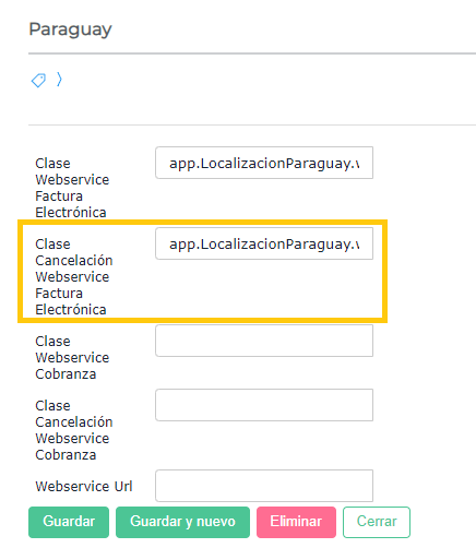 En la pestaña Configuración avanzada, en el campo Clase Cancelación Webservice Factura Electrónica completa: