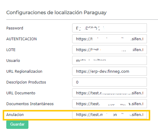 En la view Configuraciones de localización Paraguay, completa el campo Anulación con: