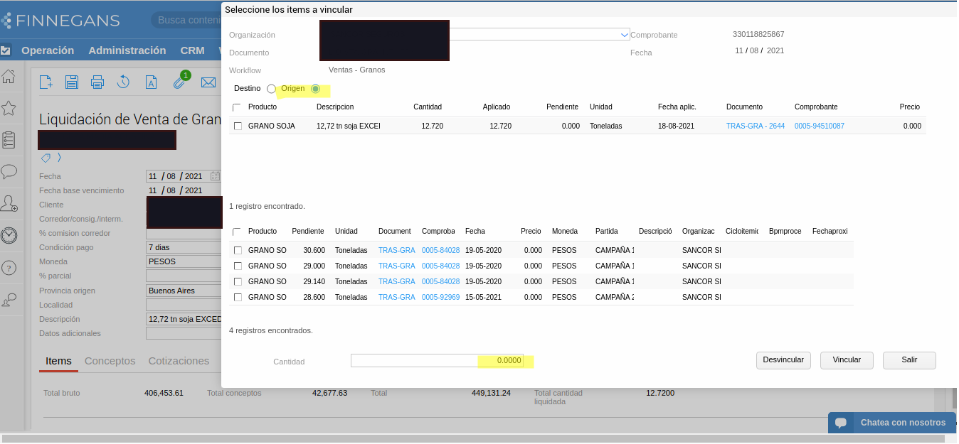 - Ir a vinculaciones por origen y desvincular la carta de porte completando con la cantidad total que corresponde para que queden disponibles todas esas cantidades.