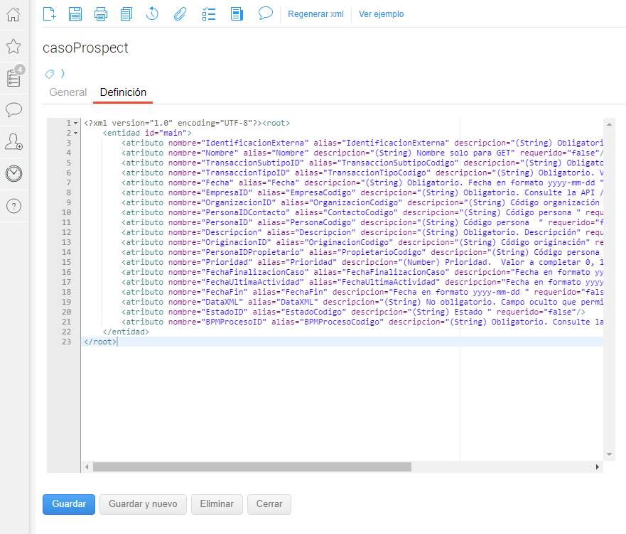 Se ingresa a las APIs desde el menú App Builder → Diccionario de APIs. El nombre de la API es casoProspect